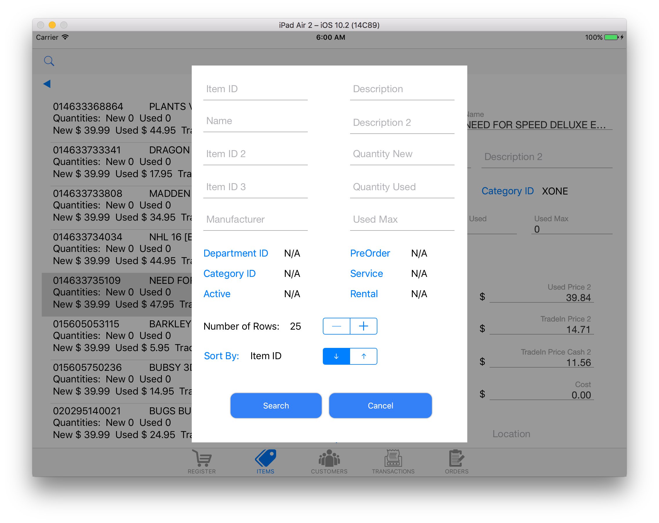 - Search and view your inventory items by item ID, name, description, category, dept, etc. View information on any of your inventory items and add it to the transaction as new or used. Serial numbered items are also supported.